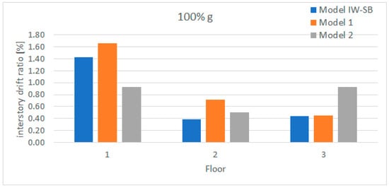 Inter-story drift comparison of Model IW-SB (this study) with Model 1 and Model 2 from FRAMA project [] for 100% g.