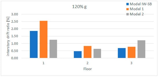 Inter-story drift comparison of Model IW-SB (this study) with Model 1 and Model 2 from FRAMA project [] for 120% g.