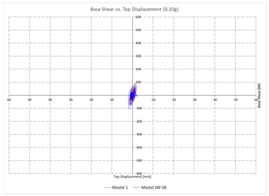Experimental base shear vs. top displacement comparison for Model 1 and Model IW-SB for 0.10 g.