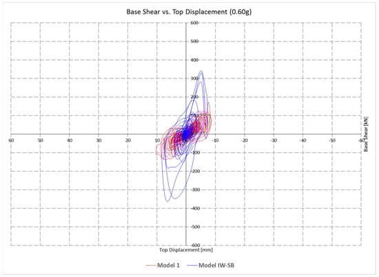 Experimental base shear vs. top displacement comparison for Model 1 and Model IW-SB for 0.60 g.