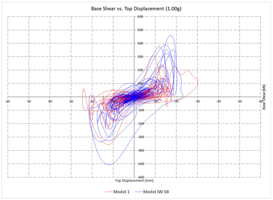 Base shear vs. top displacement graphs are compared to the referent Model 1 and presented on the following graphs (Figure 30, Figure 31, Figure 32 and Figure 33). From the results it can be observed that for higher excitation the Model IW-SB is slightly stiffer than Model 1 and thus has better seismic performance in the nonlinear zone of structural behavior.