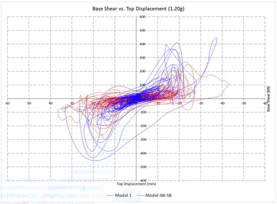 Experimental base shear vs. top displacement comparison for Model 1 and Model IW-SB for 1.20 g.