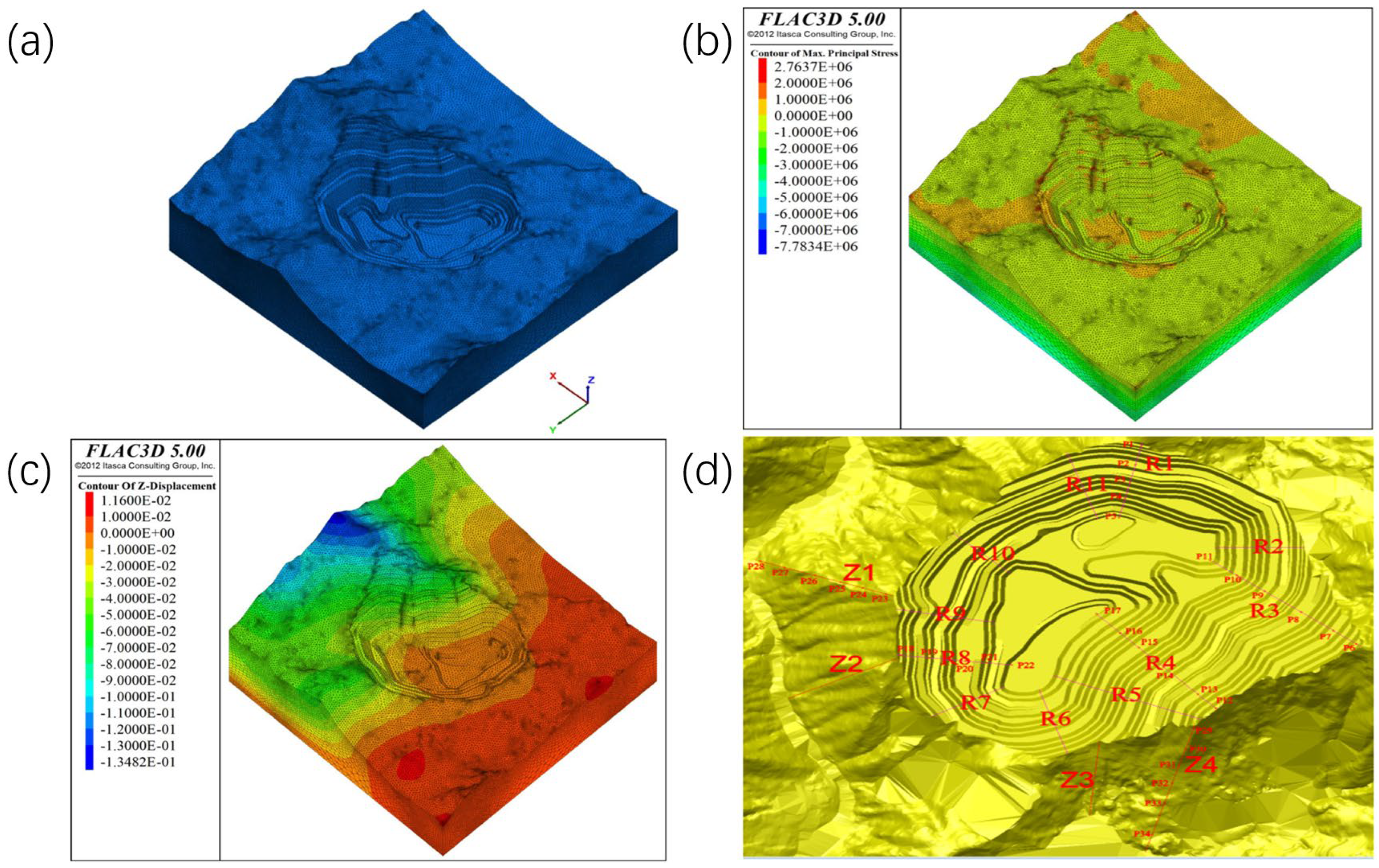 - Li, S.; Zhao, Z.; Hu, B.; Yin, T.; Chen, G.; Chen, G. Three-Dimensional Simulation Stability Analysis of Slopes from Underground to Open-Pit Mining. Minerals 2023, 13, 402. [Google Scholar] [CrossRef]