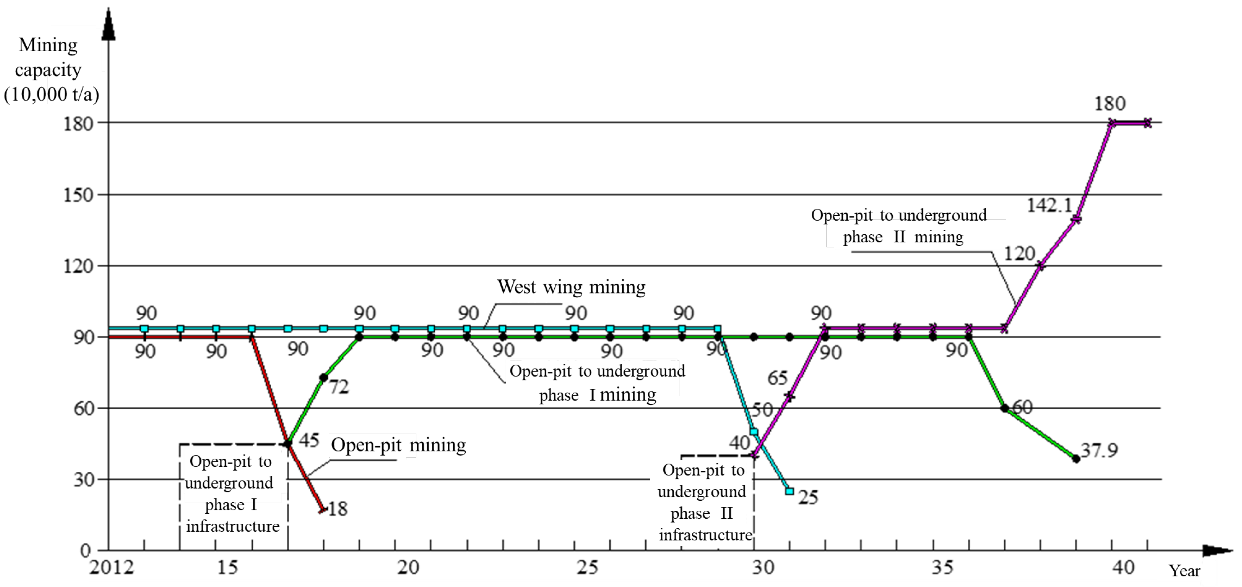 - Chung, J.; Asad, M.W.A.; Topal, E. Timing of transition from open-pit to underground mining: A simultaneous optimisation model for open-pit and underground mine production schedules. Resour. Policy 2022, 77, 102632. [Google Scholar] [CrossRef]