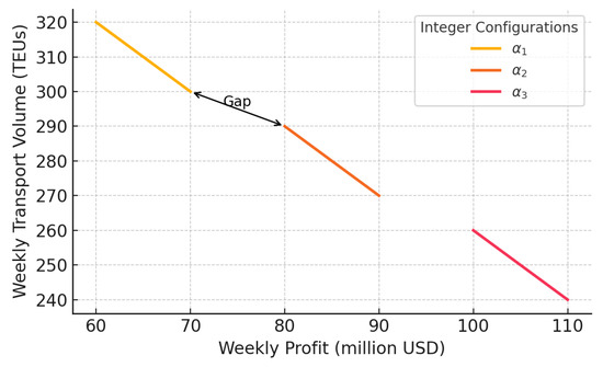 - We analyze the structural properties of the Pareto frontier for the bi-objective MIP model and find that it consists of a finite union of continuous, piecewise linear segments. We also show that the global frontier is generally non-convex and can exhibit discontinuities due to the discrete nature of ship assignment and route operation decisions. This structural insight provides a precise characterization of the optimal trade-offs between profit maximization and transport volume, illuminating the set of efficient solutions.