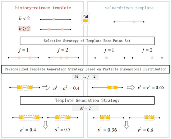 Firstly, an example is given to illustrate the brief process of template generation. Suppose there is a particle that has two dimensions. Figure 2 shows a brief process of generating a personalized template for this particle, and the same applies to the other particles. For specific details, please refer to the following content of this section. The pink part on the left of the figure represents the generation process of the history-retrace template, while the part on the right shows the generation process of the value-driven template. The length of the yellow square is the interval expansion value obtained through the interval expansion strategy. The two small dots on the left and right of the black line segment in the figure represent the upper and lower bounds of the particle dimension value. j represents the dimension of the particle. a refers to the generated history-retrace template, and v represents the generated value-driven template.