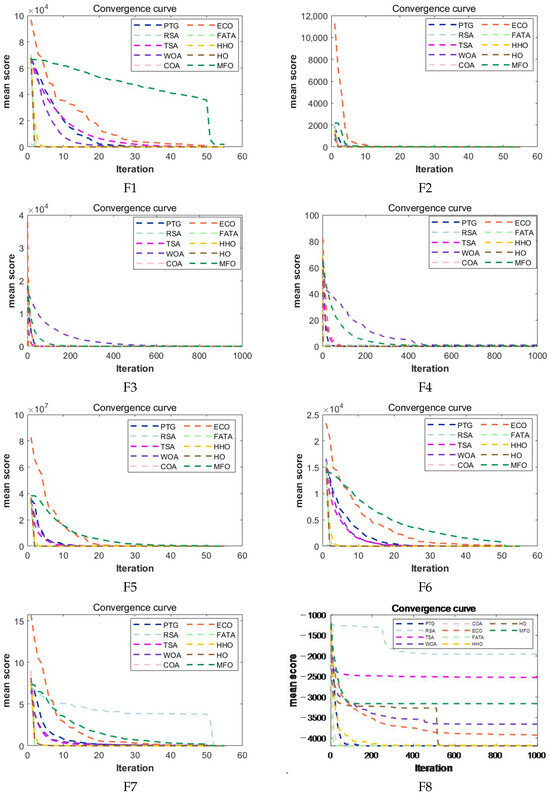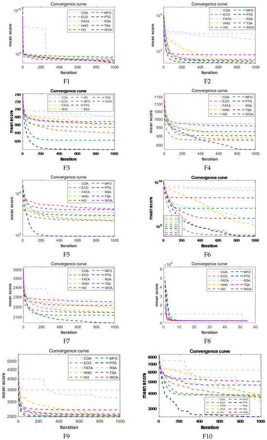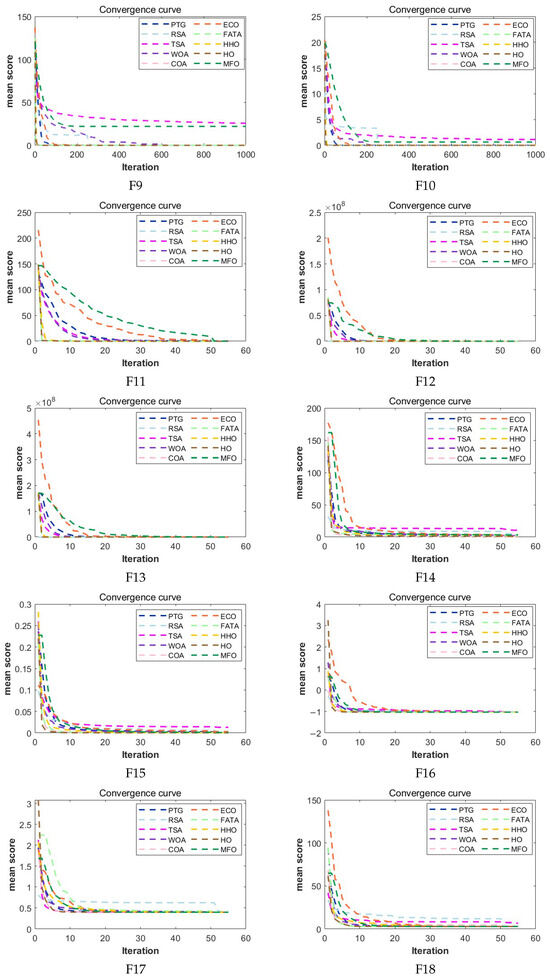 Convergence curves of PTG and 9 optimization algorithms in F1–F23 on CEC2005.