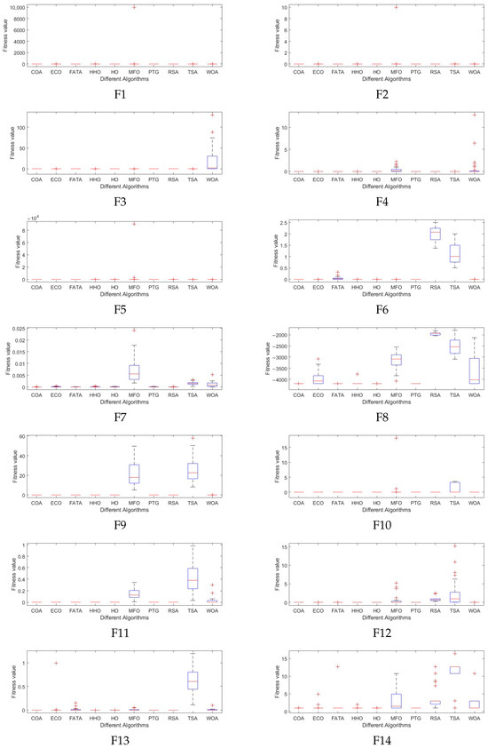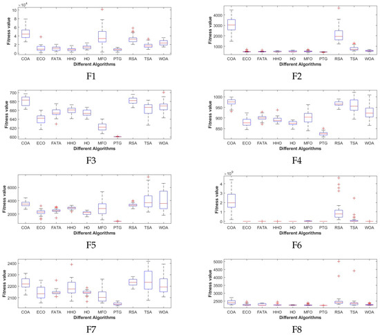 As can be seen from Table 3 and Table 4. In the comparison of unimodal benchmark functions, PTG ranks first among F1-F4 and F6 functions, and the final result of the F5 function is far superior to other algorithms except COA, with a standard deviation of 0 and ranking second. It can be seen from Figure 3 that the convergence speed of the PTG algorithm is not always the fastest among the F1–F4 and F6 functions, but it converges to a solution better than or equal to that of other algorithms before about 50 iterations. In the F4 function, although its convergence speed is slower than that of the four algorithms, it is better than their function values, so PTG has the ability to maintain diversity when converging. As can be seen from Figure 4, in F1–F7, the data of PTG running independently for 30 times presents a centralized distribution, and compared with other algorithms, there are no outliers. A “+” in the figure indicates an outlier of the data. To sum up, it can be seen that the algorithm is effective in solving the unimodal benchmark function problem.