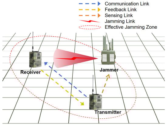 As shown in Figure 1, the communication scenario consists of a pair of transceivers and an active jammer, where the transmitter and receiver continuously communicate. The intelligent agent at the receiver end perceives the electromagnetic environment in real time to acquire the features of the jamming signals, and the transmitter dynamically selects anti-jamming strategies. When the transmitter sends signals to the receiver, the jammer performs electromagnetic jamming on the receiver’s channel access, blocking legitimate communications between the two parties.