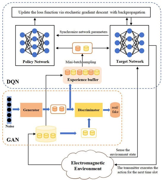 To address the above challenges, this paper investigates how Generative Adversarial Networks (GANs) can enhance the convergence speed of DQN anti-jamming algorithms based on the traditional DQN framework. As a generative model, GANs can solve the problem of insufficient samples by generating similar samples with the same distribution as real samples, as has been widely applied in fields such as image processing [,], target detection [,], and audio generation [,,]. This paper applies GANs to the field of communication anti-jamming and proposes a small-sample anti-jamming decision method based on a GAN-enhanced Deep Q-Network (GA-DQN). The method uses a GAN to independently learn from collected jamming signals, capture the latent distribution of jamming signals, and generate training samples that approximate the jamming signals distribution to construct a mixed experience replay buffer. Then, a stochastic gradient descent method is adopted to train the policy network, which significantly improves the number and diversity of samples obtained in each algorithm iteration and accelerates the training process of the policy network.