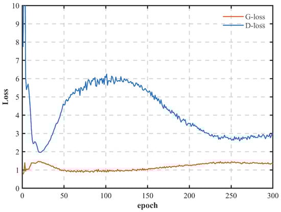 Figure 4 shows the process of the simultaneous convergence of the loss functions of the generator and the discriminator. Due to the mutual antagonism between the two networks, in the initial stage of training the oscillation of the generator loss is relatively obvious, reflecting that the learning of the time–frequency characteristics of the jamming samples by the generator of the GAN network is still unstable. From the overall trend, the loss function of the discriminator network shows a decreasing trend, while the loss function of the generator shows an increasing trend, indicating that the discrimination ability of the discriminator is improving. When the number of iterations exceeds 250, both the generator loss and the discriminator loss function tend to be stable, and the network can converge.