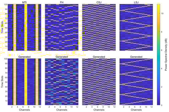 To support the performance analysis and comparison of small-sample jamming signal data augmentation in this paper, four types of jamming signals were provided for sample generation by a GAN: Multi-Tone Jamming (MTJ), Frequency-Hopping Jamming (FH), Comb-shaped Sweeping Jamming (CSJ), and Linear Sweeping Jamming (LSJ). The specific parameters are shown in Table 1. In the dataset, the jamming signals are transmitted through a random noise channel. The JNR can be selected within the range of −4 dB to 16 dB (with a step size of 2). The shape is set as 12 × 100, where the number of channels is 12 and the jamming time slots number 100.