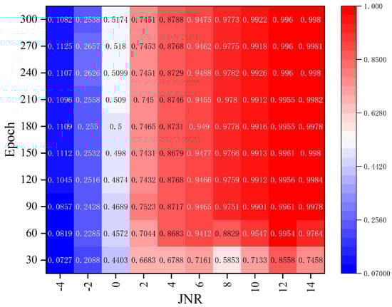 Figure 6 presents the Pearson correlation coefficients between the samples generated under the JNR and iteration counts and the original jamming samples, demonstrating the generalization ability of the LACGAN. It can be seen from the figure that the Pearson correlation coefficient was basically positively correlated with the iteration count and JNR. As the iteration count or the JNR increased, the Pearson correlation coefficient also increased. In subsequent experiments, the JNR was set to 10, and when the iteration count reached 90 the Pearson correlation coefficient had exceeded 0.99. Therefore, the iteration count of the GAN was set to 90 in the subsequent experiments.