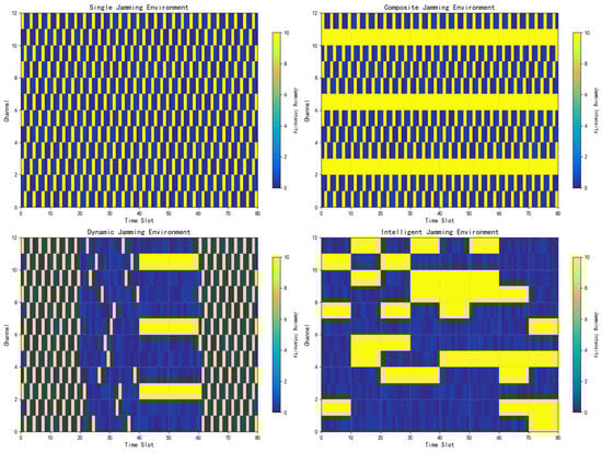 In the performance comparison simulation, four distinct jamming environments were configured to analyze the anti-jamming performance and robustness of the proposed algorithm, as can be seen from Figure 7: