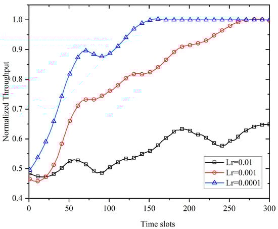 In neural network training, the learning rate is of great importance to the performance of the neural network. To set appropriate learning rate parameters, this paper analyzed the performance of the DQN algorithm at different learning rates in a single-jamming environment. Figure 8 compares the normalized throughput performance of the algorithm proposed in this paper when the learning rates were 0.01, 0.001, and 0.0001, respectively. It can be seen from the figure that when the learning rate was 0.01, due to the too-fast convergence of the neural network parameters, the DQN calculation was unstable and problems such as gradient explosion occurred; when the learning rate was 0.0001, the convergence speed of the DQN network was slow and the ideal performance was not achieved; when the learning rate was set to 0.001, the DQN converged well and could achieve the ideal performance. Therefore, this learning rate was used in the subsequent simulations.