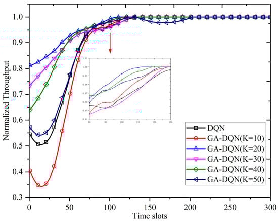 In this paper, the experience sample generation cycle of the GA-DQN algorithm was set to k time slots. To achieve optimal performance, it was necessary to validate the impact of different generation cycles K on the algorithm’s performance. Figure 9 compares the normalized performance of the proposed algorithm in different generation cycles () in a single-jamming environment. When , it corresponded to the traditional DQN algorithm; when , the GAN could not effectively learn the jamming signal characteristics, due to the excessively short generation cycle, which affected the algorithm’s convergence; when , the longer generation cycles failed to achieve the optimal performance; when , the GAN could both learn the jamming signal characteristics and effectively improve the convergence speed, achieving the ideal effect. Therefore, the experience sample generation cycle was set to 20 in the subsequent experiments.