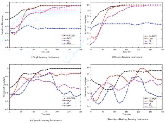 To verify the anti-jamming decision-making capability of the GA-DQN algorithm, this paper compares the GA-DQN algorithm with the conventional DQN algorithm [], the Proximal Policy Optimization algorithm (PPO) [], and the Q-learning algorithm []. For an objective analysis of the performance of the proposed algorithm, the parameters of the algorithms involved in the comparison were all set to the same values as those of the proposed algorithm. The maximum capacity of the experience replay buffer was 10,000, and the batch processing size was 64. The other simulation parameters were set as shown in Table 2. In addition, the normalized throughput of rewards was adopted as the evaluation index for the anti-jamming decision-making capability of the intelligent algorithm, and the sliding average method (with a window length of 50) was used for curve plotting to obtain smooth curves.