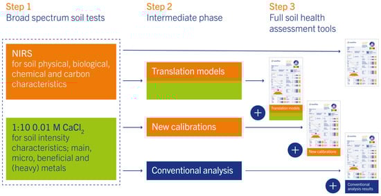 A brief overview of the three-step approach is given below. In step 1, key soil properties and promising soil testing techniques were selected (and the techniques were analytically calibrated and validated) for measuring meaningful characteristics so as to obtain a rapid and integrated soil health assessment. Near-Infrared spectroscopy (NIRS) (Q-interline, Tølløse, Denmark) was chosen for measuring key physical, chemical, and biological soil characteristics under controlled laboratory conditions, using dried and sieved soil samples, while multi-element extractions were performed with 0.01 M CaCl2 followed by Inductive Coupled Plasma Mass Spectroscopy (ICP-MS) (Agilent Technologies, Santa Clara, CA, USA) and Discrete Analysis (DA) (KPM (AMS Alliance, Westborough, MA, USA) for assessing a wide range of plant available elements.