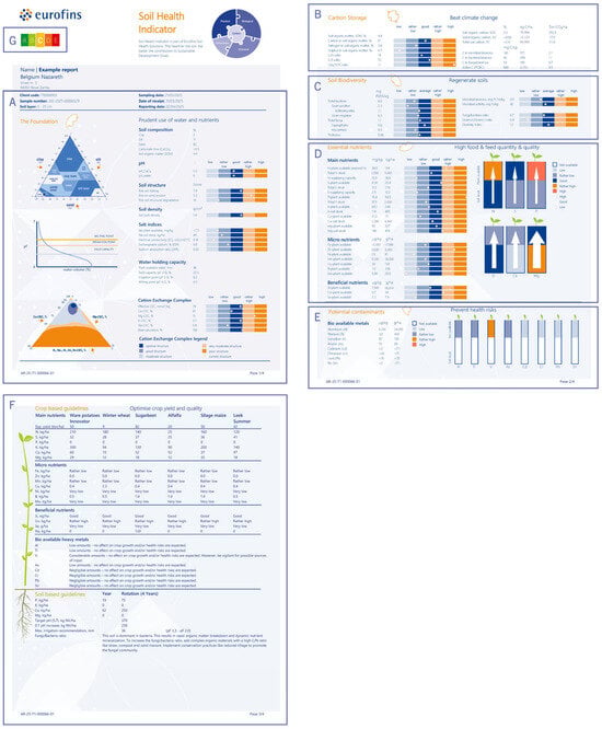 The Soil Health Indicator (SHI) report has seven 7 sections (Figure 2). The first section (A) is the soil physical part. The second section (B) reports on soil biological characteristics, the third section (C) on soil carbon fractions, the fourth section (D) on essential nutrient elements, the fifth section (E) on potential contaminants (heavy metals), the sixth section (F) on recommendations of crop and soil management practices, and the seventh section (G) on the ABCDE-score. The ABCDE-score reflects the soil health assessment proposed by the European Commission (proposal for Soil Monitoring Law) []. The ABCDE-score is based on soil tests for salinization (EC), loss of organic carbon (SOC/Clay ratio), excess nutrient accumulation in soil (P), soil contamination (concentrations of heavy metals in soils), acidification (pH), and loss of biodiversity (microbial biomass), and uses indicative thresholds.