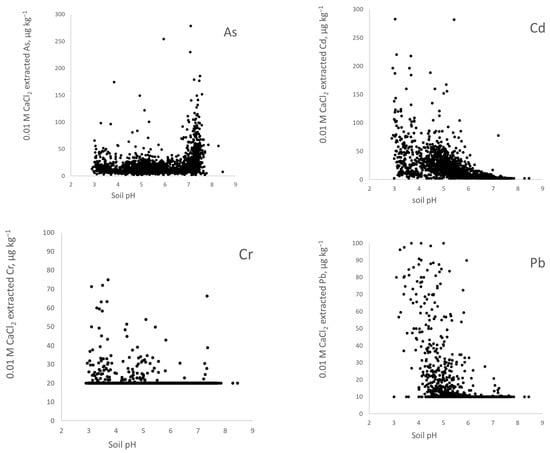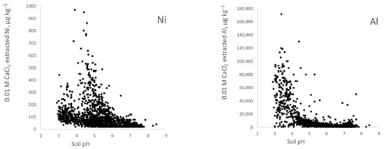 Relationship between soil pH—0.01 M CaCl2 (x-axis) and 0.01 M CaCl2-extracted nickel (Ni), aluminum (Al), arsenic (As), cadmium (Cd), chromium (Cr), and lead (Pb) (y-axis, µg kg−1). Soil samples (0–25/30 cm) originate from agricultural, natural, and urban fields in Europe (n = 1886).