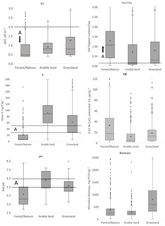 Box plot of soil EC, SOC:clay ratio, soil Olsen P, soil cadmium (Cd), soil pH, and soil biomass values in forest/nature, arable land, and grassland soils. For methods and units, see Table 4. For the ABCDE score, we considered A = very good; letters printed in the figure refer to these ABCDE categories. The horizontal line within each box represents the median; the "x" denotes the mean.