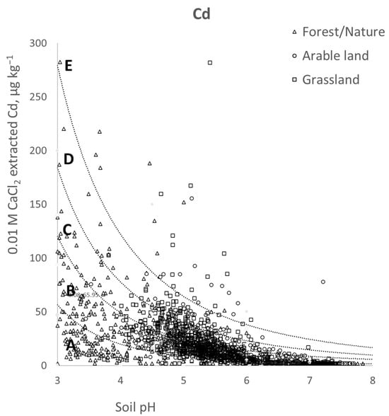 Target soil pH values were included in the ABCDE score (Table 4; Figure 4), with a broad range (pH-CaCl2 5.5–6.5). A minimum target pH greater than 5.5 would enhance effective cation exchange capacity (CEC) [], whilst a pH value > 6.5 will decrease the plant-available cadmium and some micronutrients (Figure 4 and Figure 5). However, the optimum or target pH is a compromise, balancing the bioavailability of elements such as copper (Cu) and manganese (Mn), which are more bioavailable at low pH, and molybdenum (Mo), which becomes less available at low pH.
