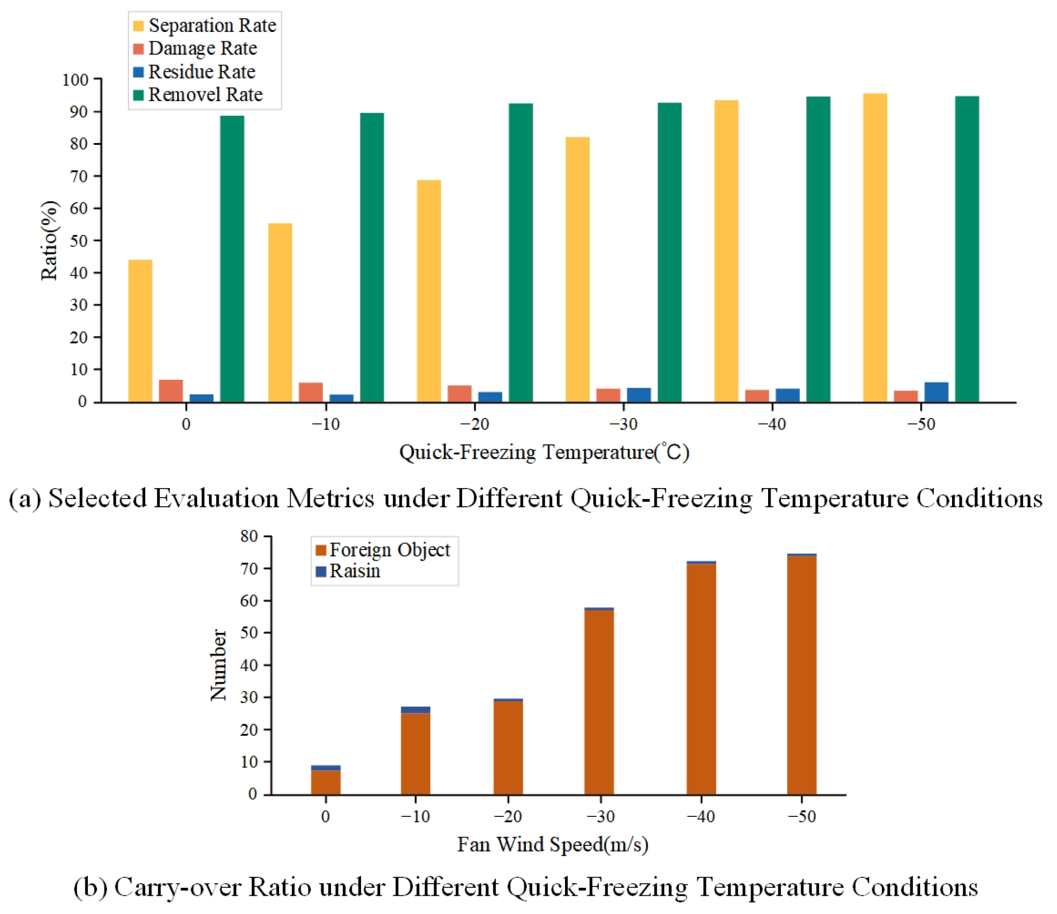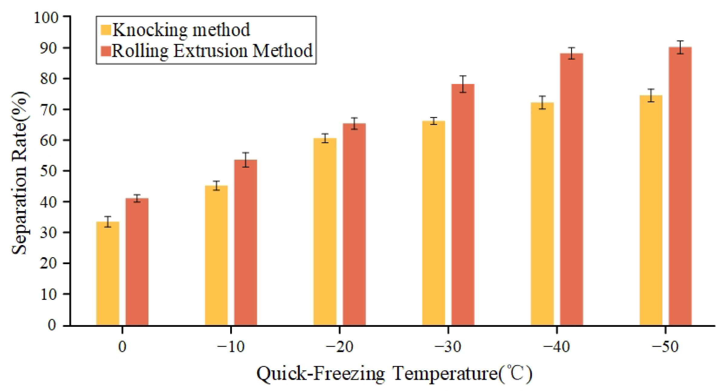 Separation rate of materials subjected to different quick-freezing temperatures using various separation methods.