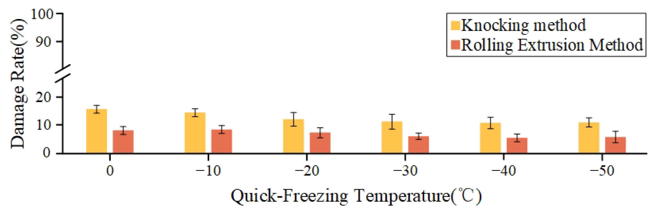 Damage rate of materials subjected to different quick-freezing temperatures employing various separation methods.