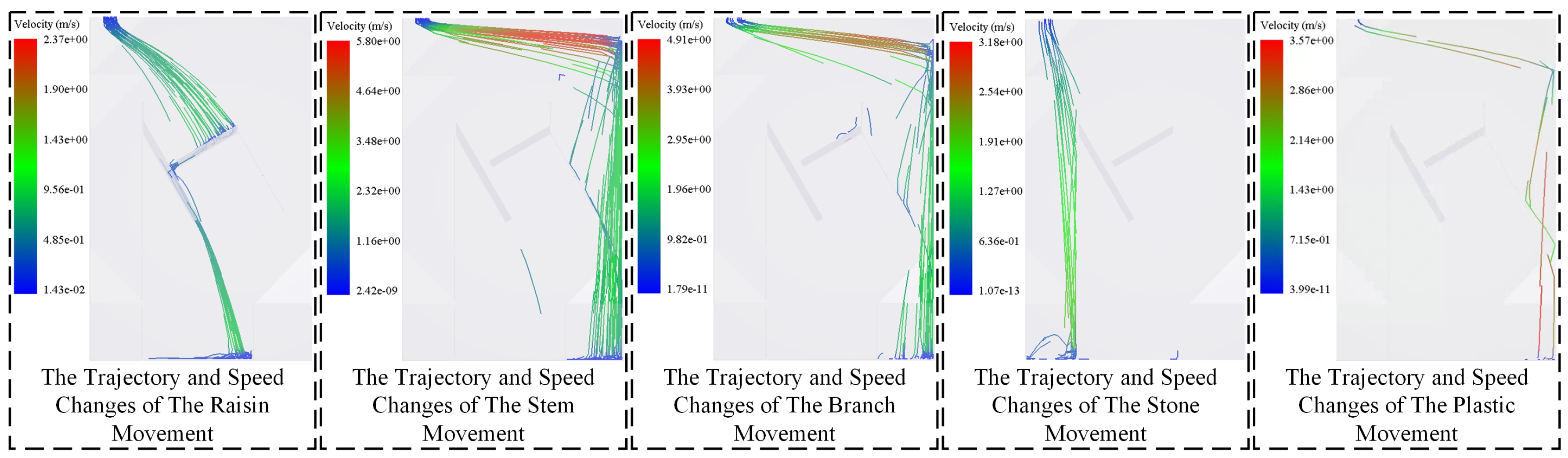 Trajectory and velocity variation of raisins and various foreign objects during the screening process.