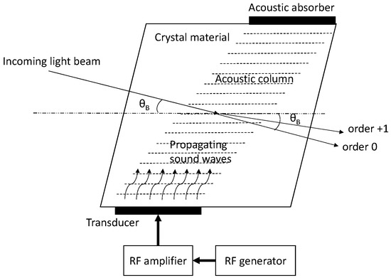 - Goutzoulis, A.P.; Pape, D.R. Design of Acousto-Optic Deflectors, in Design and Fabrication of Acousto-Optic Devices; Marcel Dekker: New York, NY, USA; Basel, Switzerland; Hong Kong, China, 1994; pp. 69–122. [Google Scholar]