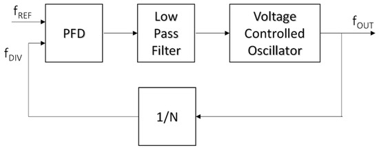 The RF generator in which a Phase-Locked-Loop (PLL) design is used, which already has space heritage [21,25,26]. The top-level topology of the PLL design in shown in Figure 2. The design uses a reference oscillator (fREF), generating a stable reference signal against which the feedback signal (fDIV) is compared in the Phase-Frequency Detector (PFD). If both signals are out of phase, an error signal is generated by the PFD aligned to the phase difference. This signal is converted by a Low-Pass Filter (LPF) into a voltage level capable of driving the Voltage-Controlled Oscillator (VCO) towards the requested frequency. The latter generates the RF output but also feeds back a divided signal (1/N) to the PFD for comparison.