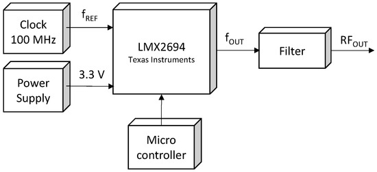 In order to translate this design into a space-qualified setup, the selection of the components has to be carried out in a rigorous way. In Figure 3, the LMX2694 of Texas Instrument (Dallas, Texas, USA) [27] is used as the core of the PLL design. This device has limited space heritage but offers many features. The PLL setup is a fractional N-PLL, using a delta-sigma modulator. The chip houses all the key blocks mentioned in Figure 2. The LMX2694 only needs a reference oscillator of 100 MHz and a 3.3 V power supply, which is common in space designs. The output signal needs additional filtering in order to fulfil the unwanted spectral component suppression requirement of <−30 dBc. The LMX2694 uses several internal VCOs, which create the possibility to generate a wide variety of frequencies at the output (fOUT). The internal VCOs operate between 8.1 GHz and 14.7 GHz. By using internal dividers, the frequency is downscaled to a value between 39.3 and 15,100 MHz, which includes the frequency domain 45–250 MHz, applicable for the VIS, NIR, and UV optical range.