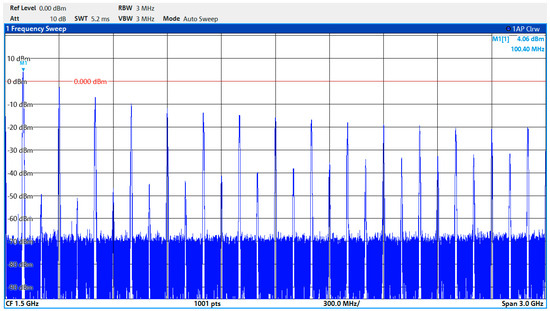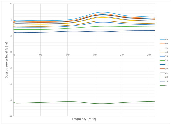 In Figure 5, the frequency is varied between 40 and 300 MHz. The internal current setting, which stipulates the output power, can be set at a value between 63 and 0. The results show a variable output power level between −6 dBm and +5 dBm for the first harmonic. The output power uncertainty is less than 0.01 mW. The power consumption of the chip is around 1 W. The accuracy between 40 and 350 MHz variates between 32 and 115 Hz. The frequency stability is better than 1 Hz, and the stabilization time is less than 5 ms.