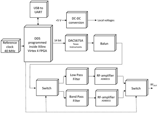 Based on the availability, mass, power consumption, and used PCB area, the Virtex 4 FPGA, combined with the Texas Instruments 14-bit DAC5675A-SP, was used in a test setup (Figure 7). Due to the limited clock frequency of 400 MHz, the VIS optical range (and partially the UV range) can be covered by using a steerable double switch at the output of the setup. This switch is necessary to cover a frequency range of more than one octave (45 up to 180 MHz). Two seventh-order passive Cauer filters (a low-pass filter with a cut off at 90 MHz, and a bandpass filter 90–180 MHz) were used, in combination with an AD8001S RF amplifier of Analog Devices [38]. The latter is used to increase to output power level up to an acceptable level (>0 dBm). In order to communicate with the Virtex 4 FPGA, a Universal Serial Bus to Universal Asynchronous Receiver-Transmitter (USB-to-UART) transformer is used. All necessary supply voltages are generated based on a +5 V input.