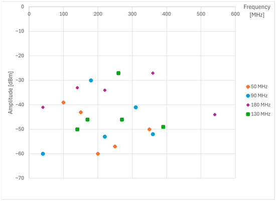 The results show an output power level between +0.5 dBm at 180 MHz and +7 dBm at 45 MHz, depending on the output frequency. The generated harmonics and spur levels are shown in Figure 8 for different generated frequencies. As can be seen, many different spurs and harmonics exist, depending on the selected fundamental frequency. The intensity varies as a function of frequency selection. The power consumption of the setup is 4.1 W for the complete frequency range. This is mainly due to the FPGA-DAC combination. The output power uncertainty is less than 1 mW. Although not necessary for the AOTF application, this setup has the advantage of having a high resolution and accuracy (up to the Hz-range). Also, the requirements of long-term stability and stabilization time are easily met.