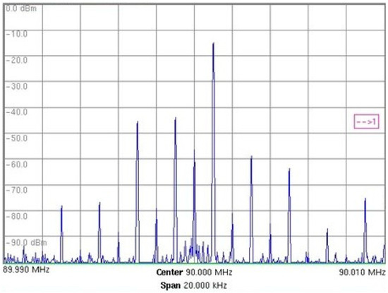 The generated output frequency at 90.001 MHz using a 90 MHz reference oscillator and a 1 kHz DDS signal in the USB setting shows many different harmonics and spurs (Figure 11). The suppression of these signals is at barely −30 dBc. The output power level of the RF signal is rather low (around −15 dBm). This requires an additional RF amplifier block at the output of the RF generator in order to fulfill the >0 dBm requirement. This will again consume the PCB area, mass, volume, and power. The frequency resolution depends on the resolution of the DDS inside the FPGA. Due to the small steps achievable in a DDS setup (see paragraph 4.2), the frequency resolution can be met easily.