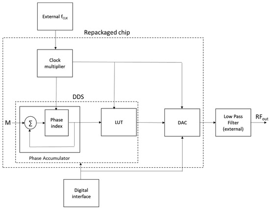 The die of the chip is embedded in a space-resistant enclosure, for which specific repackaging techniques are available [43]. Several commercial devices exist that are able to fulfil the requirements listed in Table 1 and Table 2, e.g., AD9912 and the AD9957 from Analog Devices [44,45].