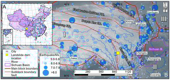 Regional geological background of the landslide dam. (A)—Nationwide base map; (B)—geological background of the landslide dam. I—Qinghai–Tibet block; II—Yangzi block; III—North China block.