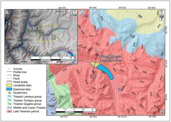 Geological map of the study area. (A)—Main fault of the study area; (B)—geological map of the Conaxue Co landslide dam; F1—Batang fault; F2—Changgai-namakuo fault; F3—Chalong-ranbu fault.