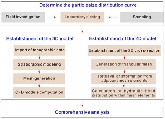 To investigate the formation mechanism of the Conaxue Co landslide dam, this study employed field investigation, numerical simulation, and comprehensive analysis. The flowchart of the whole methodology is shown in Figure 3.