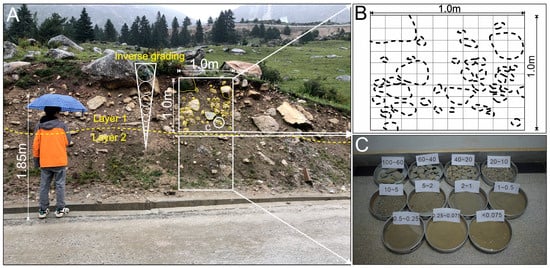 The method for determining the structure of Conaxue Co landslide dam. (A)—A typical profile of Conaxue Co landslide dam; (B)—a square area was selected to determine the distribution of particles larger than 100 mm; (C)—sampling and sieving were conducted in the laboratory to determine the distribution of particles smaller than 100 mm.