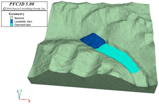 The topographic data of the landslide dam (12.5 m DEM data from https://search.asf.alaska.edu/#/, accessed on 12 December 2024) were first converted into grid format and subsequently imported into Rhinoceros 8 software. To simulate the mechanical behavior of the landslide, advanced numerical techniques were employed in the literature, in line with recent developments in slope stability analysis [,,]. Subsequently, the boundaries of the dam body and bedrock were precisely delineated, and their geometric configurations were defined based on the topographic data. Given that field investigations demonstrated distinct inverse grading structure for the Conaxue Co landslide dam, the coarse-grained and fine-grained layers were differentiated during the modeling process. Rigid spherical particles were generated for each layer based on the particle size distribution obtained through field investigation and laboratory sieving. Layer 1 exhibited a porosity of 0.55, while Layer 2 had a porosity of 0.35. Given computational limitations, a total of 16,403 spherical particles were generated in the model, including 3380 in the coarse-grained layer and 13,023 in the fine-grained layer. As the Conaxue Co landslide dam originated from a high-speed and long-distance landslide deposit, the interparticle contact behavior was modeled using the Mindlin-Hertz contact model in PFC. With reference to previous model parameters [], contact parameters were determined through trial-and-error methods and numerical tests. The finalized parameters are listed in Table 1, and the 3D particle flow model is illustrated in Figure 5.