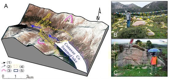 Characteristics of the Conaxue Co landslide dam. (A)—Overview of the landslide dam; (B)—dense distribution of the isolated boulders on the dam surface; (C)—isolated boulder with a particle size of 6 m; (1)—direction of debris deposit movement; (2)—flow direction; (3)—scarp; (4)—landslide dam; (5)—dammed lake. (A,C) were adapted from Song et al. [].