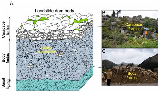 Inverse grading structure of the Conaxue Co landslide dam. (A)—Schematic diagram of the dam structure; (B)—carapace facies at the dam top; (C)—body facies at the dam middle. (C) were adapted from Song et al. [].