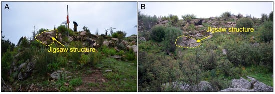 Jigsaw structures on surface boulders at Conaxue Co landslide dam. (A)—the jigsaw structures of rubble stones are visible at the top of the dam body; (B)—the jigsaw structure of rubble stones is visible within the dam body.