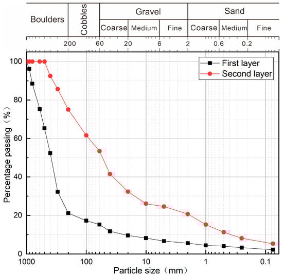 The grain composition of Layer 1 (upper layer) and Layer 2 (lower layer) in the typical profile of the Conaxue Co landslide dam exhibits a distinct left-to-right shift in the gradation curves (Figure 10). This observation quantitatively demonstrates that the structure of landslide dam exhibits pronounced vertical sorting, characterized by an upward coarsening trend in grain size along the profile. The grain size composition of each layer in the profile is specifically characterized as follows: Layer 1 deposits are predominantly composed of boulders (d > 200 mm), which account for 80%, followed by gravel (2 mm < d < 60 mm) at 10%, while crushed rock and sandy soil collectively comprise approximately 10%. Layer 2 deposits exhibit a significant reduction in blocky fragments (d > 60 mm), which drop to 47%. In this layer, boulders (d > 200 mm) account for 25%, while particles exceeding 500 mm are notably absent. Gravel (2 mm < d < 60 mm) and sandy soil constitute 33% and 20% of this layer, respectively. The particle size distribution curves of the typical landslide dam profile demonstrated that the Conaxue Co landslide dam exhibits distinct vertical zonation, characterized by a coarsening-upward structure with finer-grained materials at the base.
