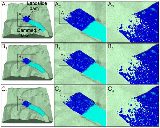 The results of particle transport within the 3D dam model under seepage conditions. (A)—initial phase; (B)—intermediate phase; (C)—final phase. A2 and A3; B2 and B3; C2 and C3 are zoomed-in views of Figures A, B, and C, respectively.