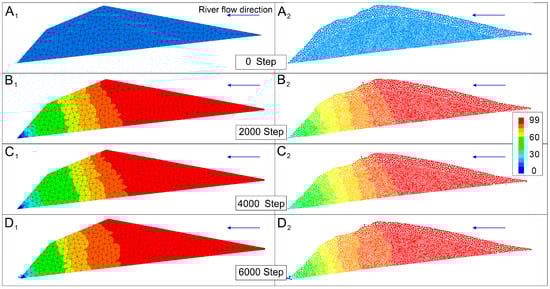 Hydraulic head distribution map in the 2D dam model. (A1–D1)—hydraulic head distribution map of the Conaxue Co landslide dam mesh; (A2–D2)—hydraulic head distribution map of particles in the Conaxue Co landslide dam area.