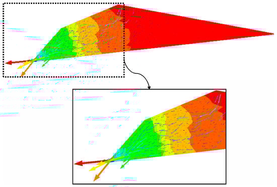 As shown in Figure 14, particle displacements within the dam body at different time intervals reveal significant downstream slope movement due to water impact. The maximum displacement (0.36 m) occurred at the toe of the downstream slope. Nevertheless, the dam maintained overall stability.