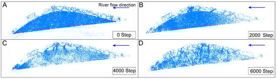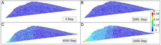Particle displacement in the Conaxue Co landslide dam. (A)—particle displacement results at time step 0; (B)—particle displacement results at time step 2000; (C)—particle displacement results at time step 4000; (D)—particle displacement results at time step 6000.